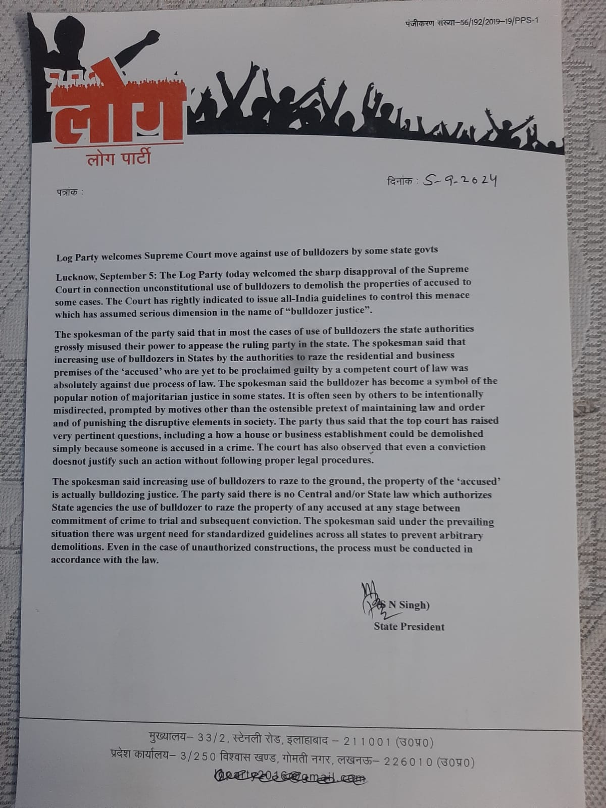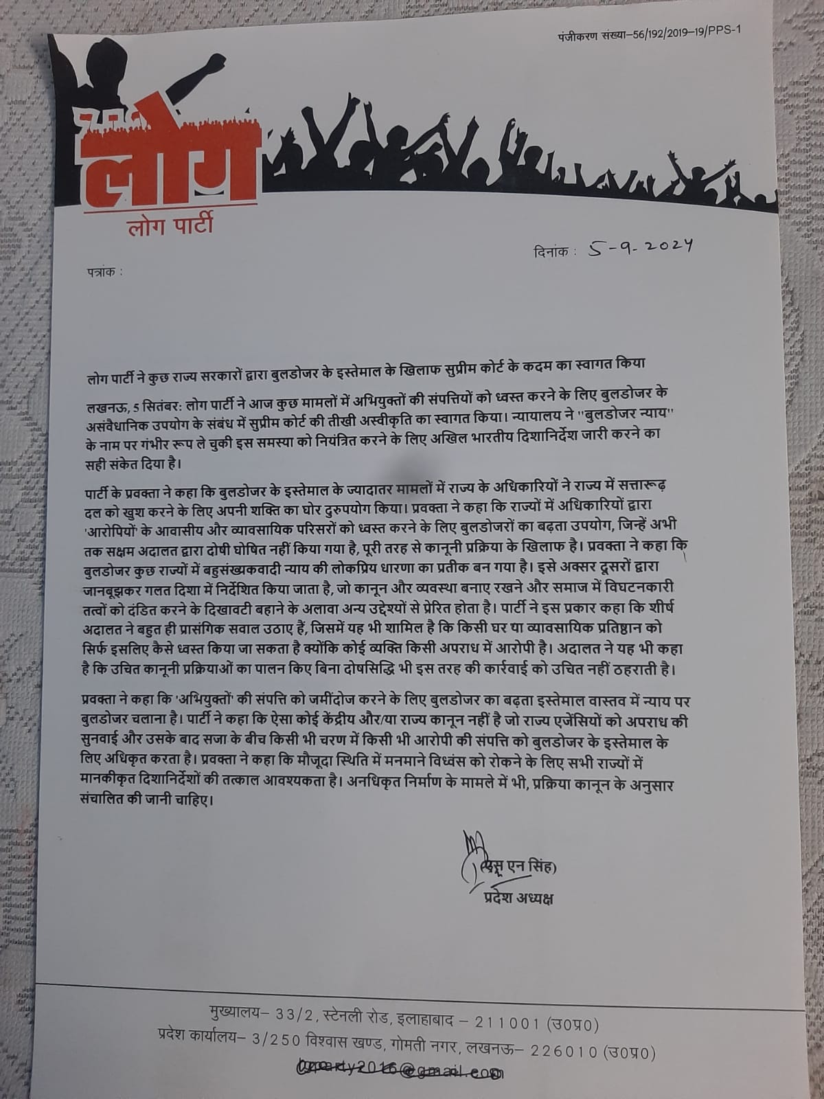 लोग पार्टी ने कुछ राज्य सरकारों द्वारा बुलडोजर के इस्तेमाल के खिलाफ सुप्रीम कोर्ट के कदम का स्वागत किया